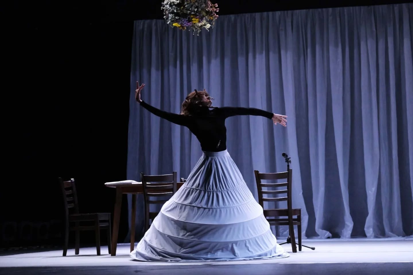El vestuario de Yaiza Pinillos —otro regalo impagable— cobra protagonismo con un vestido largo con mucho vuelo, de un material plástico, que cruje al moverse. Inequívocamente, ese traje habla de encorsetamiento, de rigidez, de armazón, de (super)estructuras, de todo lo que ha condicionado la moda femenina históricamente. Remite, por oposición, al atuendo típico de la zambra: aquí la blusa es camiseta y, en vez de anudarse bajo el busto, se coge con una pinza; y la dificultosa arquitectura de la larga falda niega la alegría volandera de los pliegues clásicos.